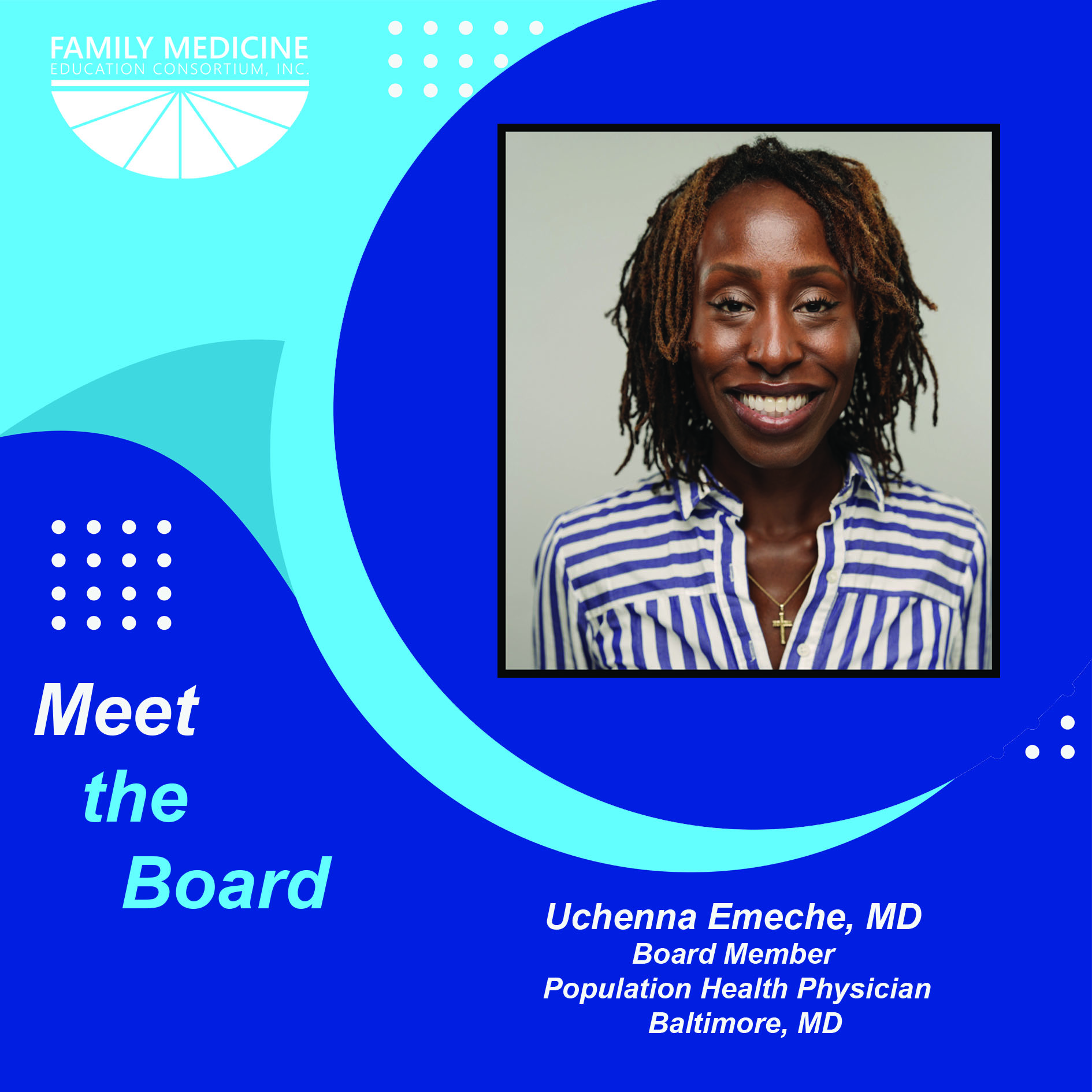 Dr. Emeche is a graduate of Case Western Reserve University School of Medicine in Cleveland, OH and traveled south for residency at Lancaster General Hospital in PA. There, she developed an interest in caring for people frequently hospitalized and later integrated a biopsychosocial lens to providing holistic health care while in fellowship. During her Healthcare Hot-spotting and Super-Utilizer aka population health fellowship, she studied and successfully implemented data to both identify opportunities for health care improvement and innovation and to track programmatic progress (and pivot accordingly). After fellowship, she took on the role of Associate Medical Director at the Medstar Franklin Square Family Health Center where she led their Patient Centered Medical Home (PCMH) initiatives. There, she also established the resident PDSA/quality improvement projects, group visits to reduce pediatric obesity rates, and the interdisciplinary team caring for medically complex, high-risk patients. Her work centered around primary care redesign, population health, process improvement, care of the complex patient, cross sector partnership, and women's health/obstetrics. She recently left full-time medicine to create a company that designs healthy neighborhoods through real estate and economic development. She uses her population health skillset to create healthy mixed-use and mixed-income neighborhoods where "people and business thrive". Dr. Emeche joined the FMEC Board in 2022.