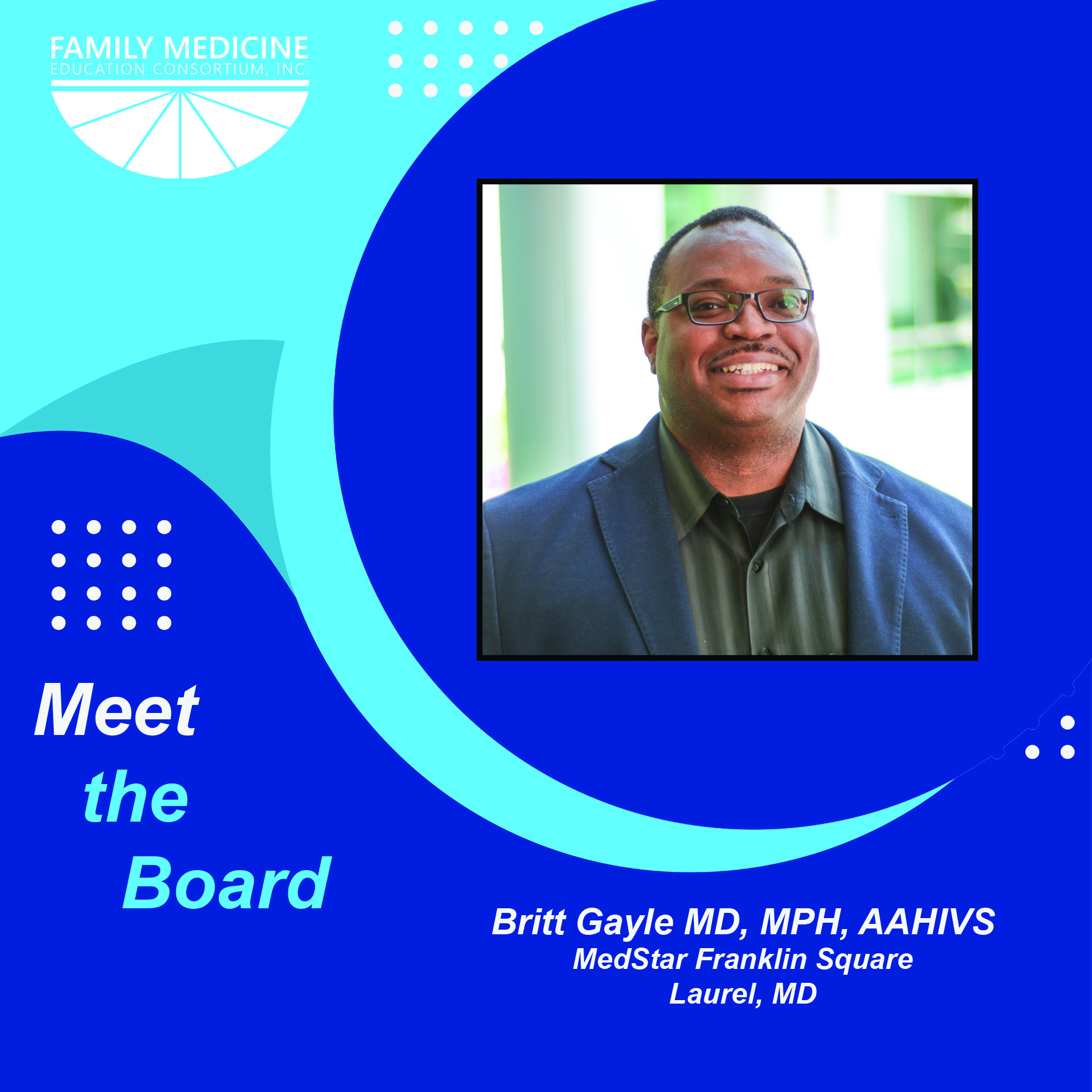 Britt Gayle MD/MPH, AAHIVS is a physician at OnTime Medical Group in Maryland and is part time faculty at MedStar Franklin Square Family Medicine Residency Program. He was previously employed at MedStar Family Medicine Residency Program as a full time residency faculty physician, faculty for Georgetown University School of Medicine’s medical student Longitudinal Integrated Clerkship, Clinical Assistant Professor, and Director of HIV services. Dr. Gayle was also an Assistant Professor at University of Maryland’s Institute of Human Virology as part of a community based research team primarily focused on the integration of opioid use disorder and viral hepatitis care, and co-developed a curriculum focusing on evidence based Opioid Use Disorder care for first year Family Medicine and Internal Medicine residents. Dr. Gayle is also the former Medical Director of Carroll County Detention Center. Dr. Gayle first became engaged in FMEC activities as a resident physician and has since presented at multiple Annual Meetings, helped resident physicians prepare their presentations, served as a proposal/abstract reviewer and poster judge, and has also served as a member of the host committee. Dr. Gayle joined the FMEC Board in 2023.