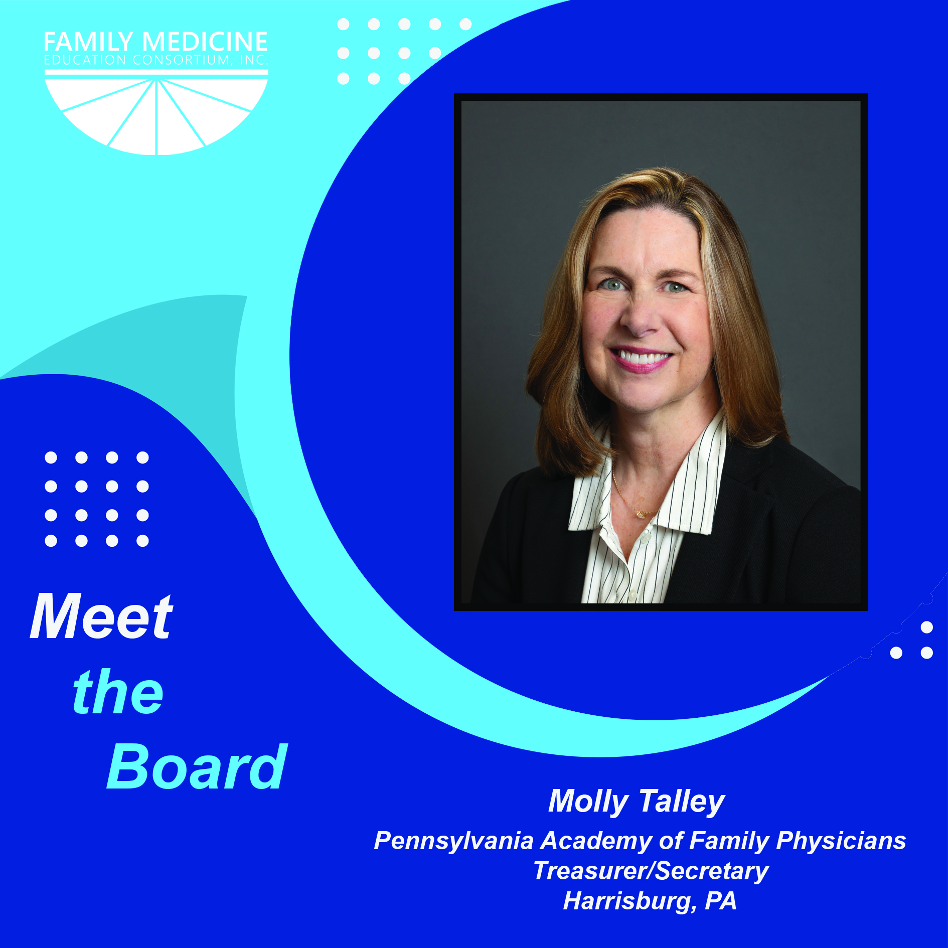 Molly joined the Pennsylvania Academy of Family Physicians (PAFP) in 2003. She is the lead staff liaison to residents and students. A non-physician, Molly brings a professional background in behavioral health, marketing and association management. With PAFP, Molly helped build a network of Pennsylvania's Family Medicine residency programs and medical schools to collaborate on the effort to strengthen student interest in Family Medicine and build initiatives to support the professional development of residents. Throughout her tenure, Molly has presented at medical schools and residency programs, regional and national conferences on topics related to Family Medicine, leadership and advocacy, and strengthening the workforce pipeline. She values collaboration with like-minded organizations like FMEC, AAFP, Primary Care Progress, and other primary care advocacy organizations to build coalitions and amplify our message. Together we are stronger.