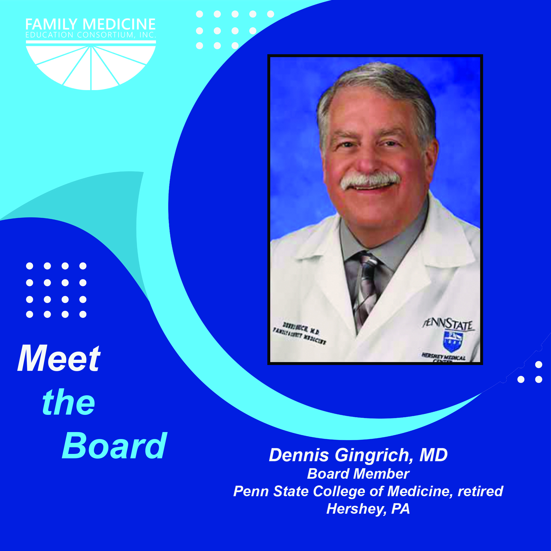 Dr. Gingrich’s introduction to FMEC was at its very first formative conference in Lancaster, Pa. in 1992, and he has attended most of the meetings since that time! He retired in 2020 after 35 years on faculty at Penn State, teaching, advising, and in community practice in his hometown of Hershey. He has served on the boards of the AAFP, the AAFP Foundation, the Center for the History of Family Medicine, the Pennsylvania Medical Society, and as president and board chair of the Pennsylvania Academy of Family Physicians. In addition to FMEC, he currently serves on the boards of a local CCRC, his church, and the Southcentral Pennsylvania AHEC. He is still engaged with Penn State on the Admissions committee, in working with affiliated pre-medical students interested in primary care, and in teaching a course for medical students on the history of medicine. He is active in community and church service, writing, promoting the relevance and importance of family medicine, and enjoying the friendships of inspiring people.