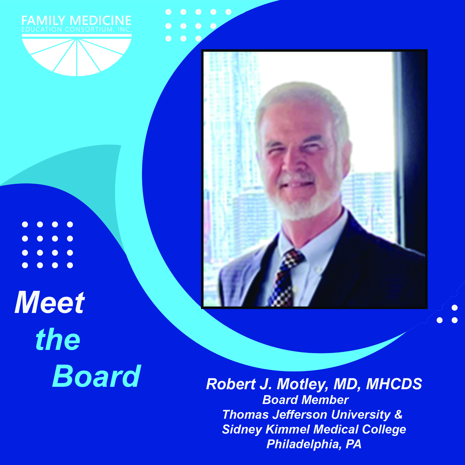 Robert J. Motley, MD, MHCDS is Clinical Professor of Family & Community Medicine, and Associate Director of the rural Physician Shortage Area Program in the Department of Family and Community Medicine at Sidney Kimmel Medical College (SKMC) and Thomas Jefferson University. Prior to his retirement from clinical care in2024, he was Vice Chair, Community Medicine and an endowed professor. Bob completed medical school at Jefferson Medical College (now SKMC) and remained at Jefferson to complete his Family Medicine residency. Bob spent the first half of his career as a private practice, community-based doctor in Montgomery and Bucks Counties, Pennsylvania. He helped form TriValley Primary Care, a group practice without walls, in 1995 and led the 34 clinician group from 2000-2004. As a clinician-educator in the Family Medicine residency at Lehigh Valley Health Network(LVHN) Allentown, PA from 2006-2015, Dr. Motley was honored three times as Resident Teacher of the Year. He served for five years on the LVHN Board of Trustees (2 as Medical Staff President) and was the Leonard Parker Pool Chair of the Department of Community Health from 2015 to 2018, until his return to Jefferson. As Vice Chair, Bob worked with multiple teams and community organizations to address priorities identified by the regional Community Health Needs Assessment. He was also the Director of the rural Physician Shortage Area Program for Sidney Kimmel Medical College for 7 years and was the Faculty Advisor for JeffHOPE, a student run free clinic serving persons experiencing homelessness through the COVID pandemic through 2024. Dr. Motley remains active in innovation projects, med student education and mentoring. Within the FMEC, he is part of a task force to help update the FMEC Innovation Network and its role in training future leaders for high quality, "smart design" primary care health delivery. Dr. Motley is a current Diplomate of the American Board of Family Medicine, holds a Certificate of Added Qualification in Geriatric Medicine and a Master of Health Care Delivery Science (MHCDS) from Dartmouth College.