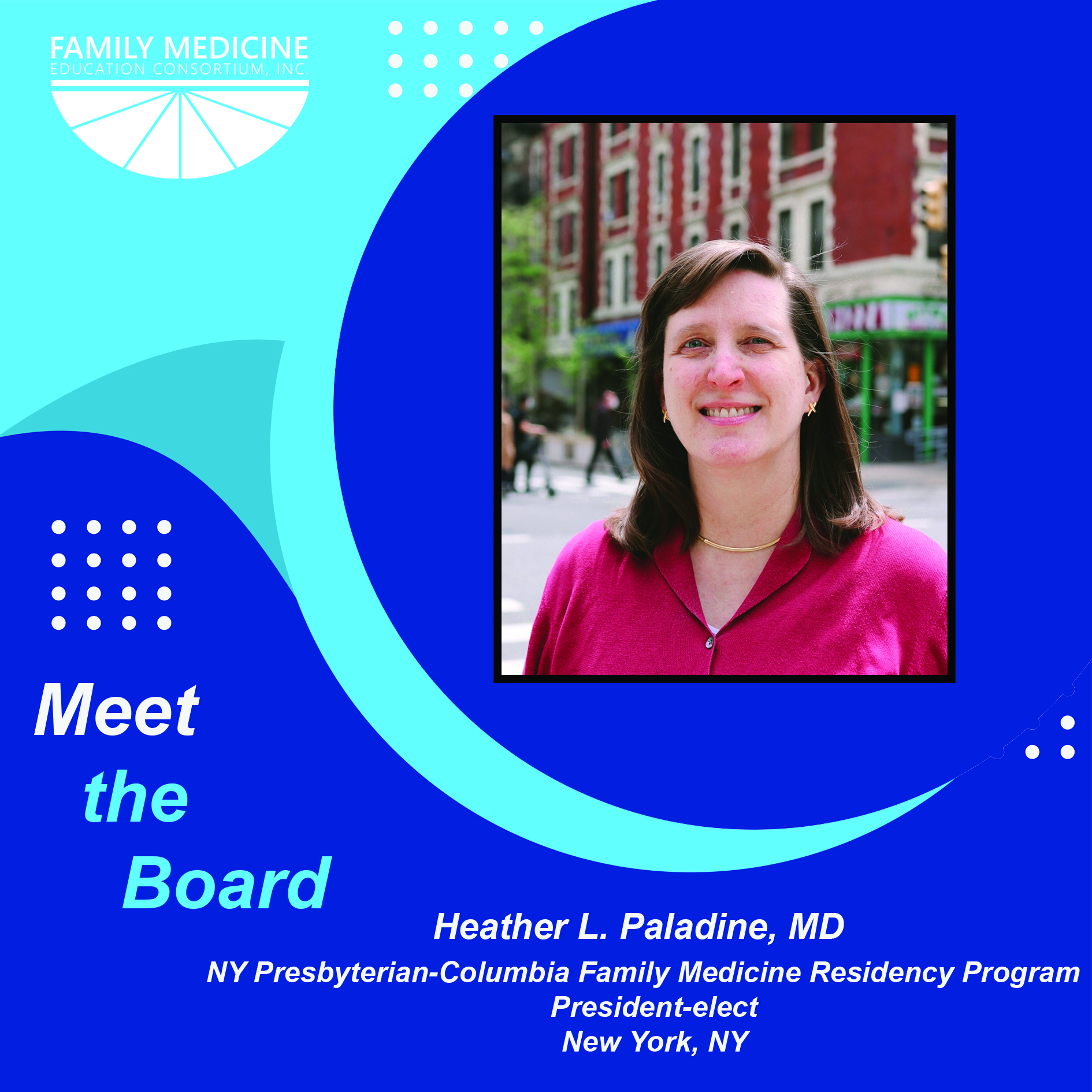 Dr. Heather Paladine has served on the FMEC Board since 2017 and is currently President-elect. She will serve as FMEC President from 2026-2028. For her day job, Dr. Paladine is a family physician who lives and practices in Manhattan, New York, where she is the residency program director at the New York Presbyterian - Columbia Family Medicine Residency Program. She supervises residents and medical students and treats a predominantly Latinx, low-income patient population. She focuses on women's health, including maternity care and reproductive health. For many years, Dr. Paladine has served on the FMEC Planning Committee Coordinators group. This is the group that convenes in the spring to review reviewer comments and ratings on the 400+ submissions for the FMEC Annual Meeting. It’s a time consuming but rewarding task, and a great opportunity to learn from the other committee members and build skills related to developing and reviewing conference proposals.