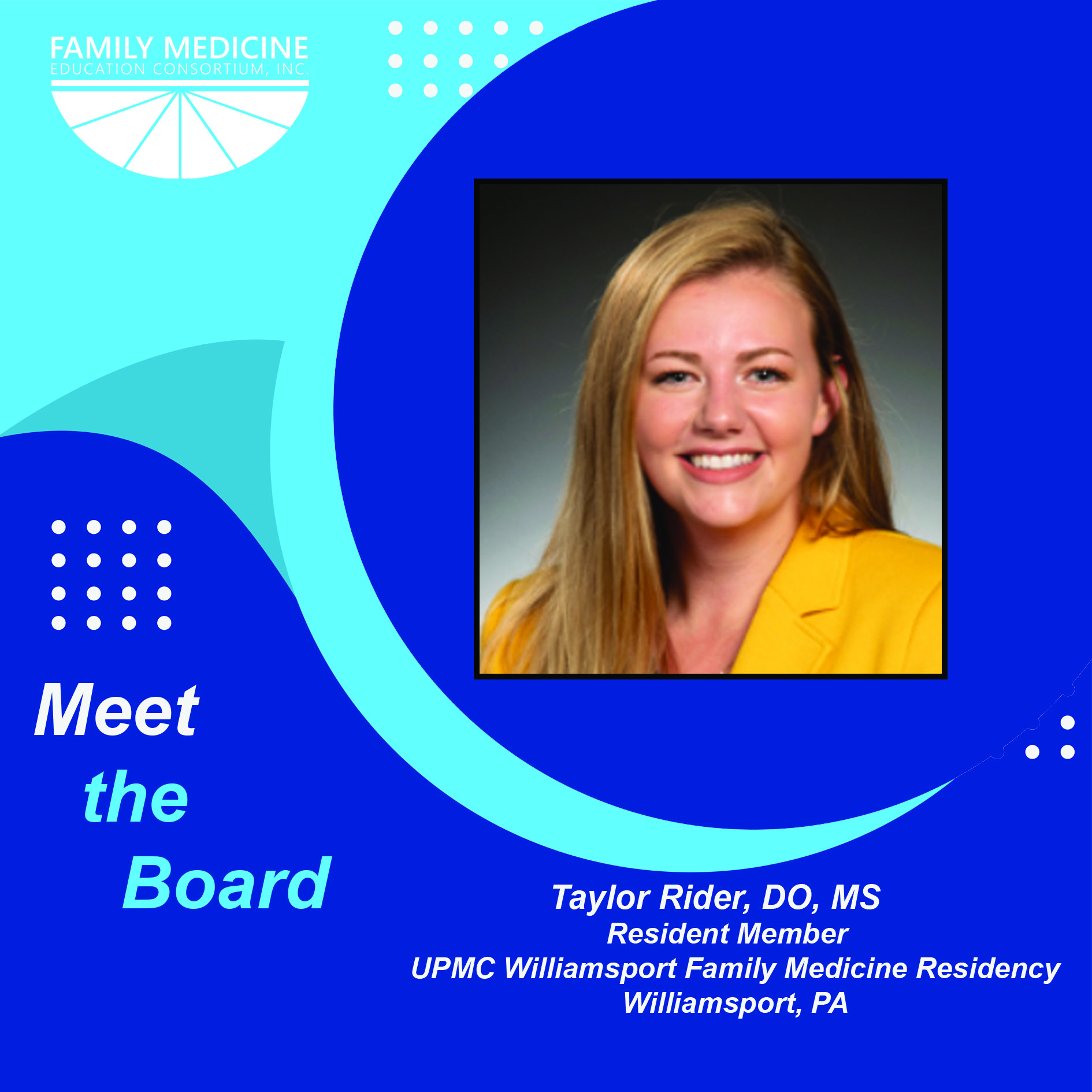 Taylor J Rider, DO is currently a PGY-3 Chief Resident at the UPMC Williamsport Family Medicine Residency. A graduate of the Philadelphia College of Osteopathic Medicine, she is a proud proponent of the osteopathic philosophy and practice. While non-traditional, her journey to family medicine underscores the distinctions of the specialty that entice many to join the cause. She cites her attendance at the FMEC Annual Meeting as a third-year medical student as an experience that clinched her love of the specialty. Her career interests include rural, full spectrum, compassionate care, osteopathic manipulative therapy (OMT), and community engagement.