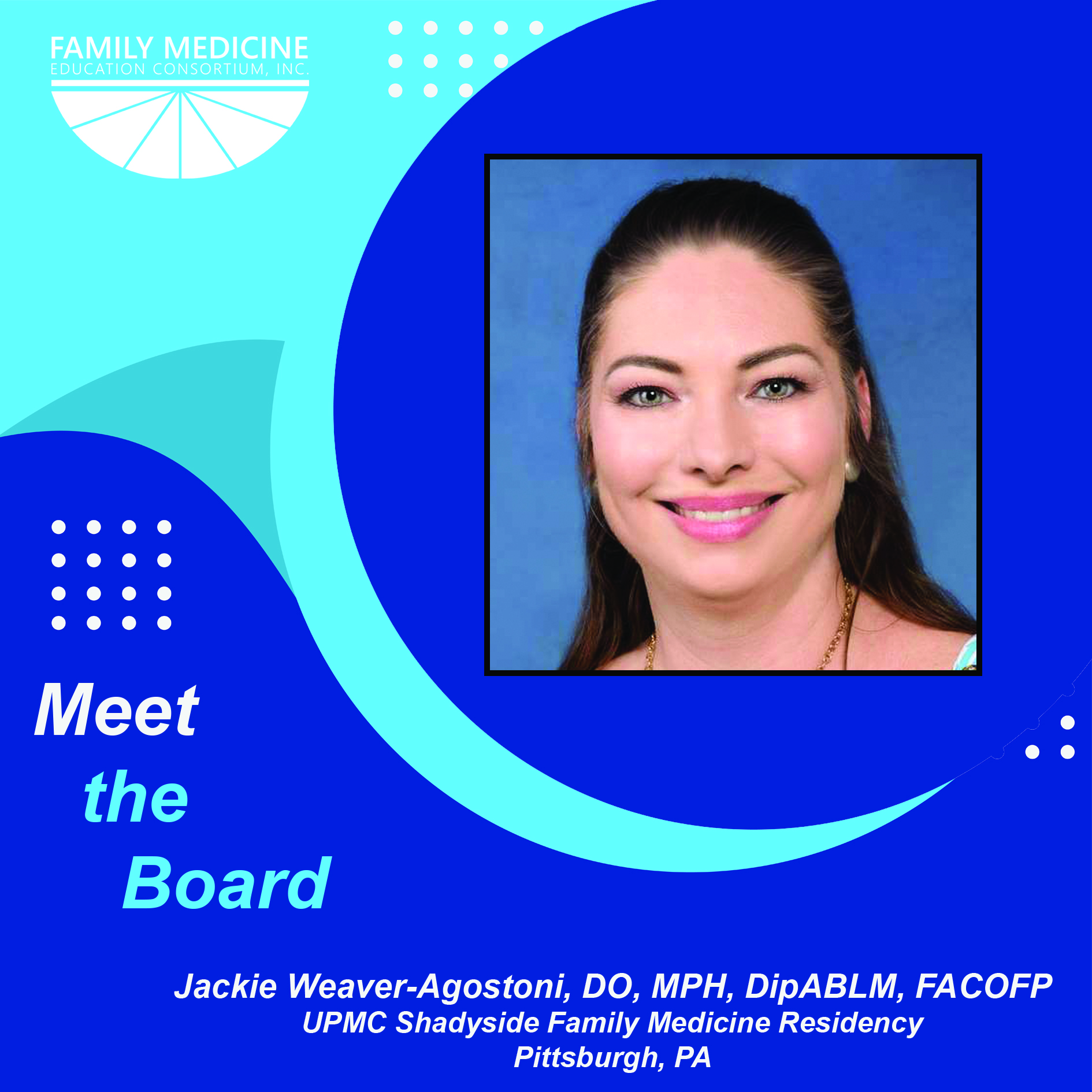 Dr. Weaver-Agostoni is the Director of the ACGME-accredited and Osteopathically Recognized Family Medicine Residency Program. She currently serves as President of the Pennsylvania Osteopathic Family Physician Society (POFPS), is Co-Chair of the UPMC GME Accreditation, Review and Quality Committee, and is an Associate Professor at the University of Pittsburgh. Prior to her appointment as director, Dr. Weaver-Agostoni served as the director of the Osteopathic Family Medicine Residency Program and director of Pre-Doctoral Education. She joined the faculty after having completed a two-year faculty development fellowship with the University of Pittsburgh Department of Family and Community Medicine, UPMC St. Margaret’s Hospital. During that time, she also earned her Master of Public Health from the University of Pittsburgh. Originally from Indiana, Pennsylvania, she graduated from Indiana University of Pennsylvania in 1998 and earned her Doctor of Osteopathy from Lake Erie College of Osteopathic Medicine in Erie, Pennsylvania in 2002. She completed her Family Medicine Residency at the Western Pennsylvania Hospital in 2005. For many years Dr. Weaver-Agostoni, along with a few other FMEC volunteers, has helped plan the osteopathic content at the FMEC Annual Meetings by reviewing sessions and making recommendations. If you would like to help make content at the Annual Meeting stronger by reviewing sessions and mentoring authors, complete the volunteer sign-up form here: https://www.fmec.net/get-involved-volunteer.